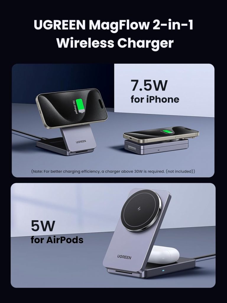 Đế sạc không dây từ tính 2 in 1 Ugreen MagFlow là phụ kiện công nghệ cao cấp, thiết kế dành riêng cho người dùng iPhone và AirPods. Với khả năng sạc nhanh, thiết kế gập gọn và tính năng từ tính mạnh mẽ, sản phẩm này mang đến trải nghiệm sạc tiện lợi, an toàn và thời thượng.